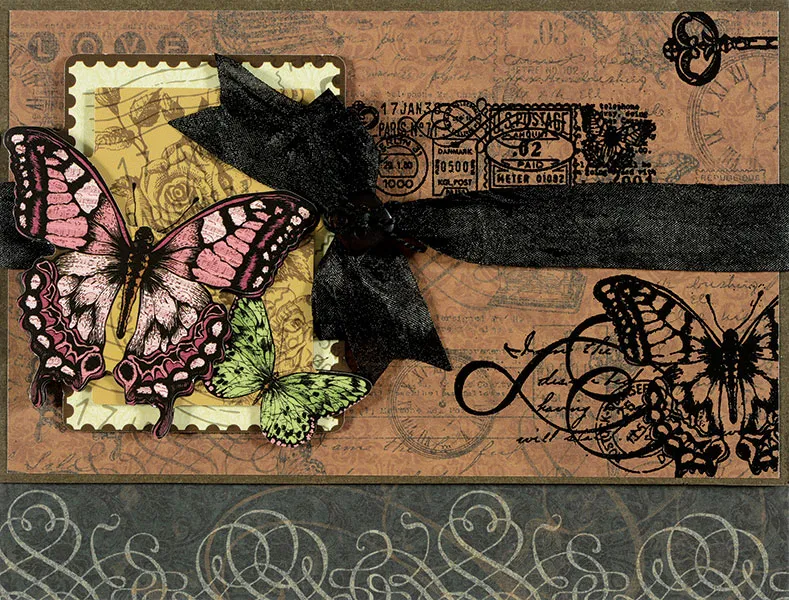 For the card front: Open the card and trim 1" off the outer front edge. Close the card and turn with the fold at the top. Cut 6½"x4" cardstock and 6¼"x3¾" Butterfly Wings brown ads paper. Stamp the butterfly/swirl image on the ads paper, extending off the lower right corner. Stamp a large key extending off the upper right edge and the postmark border across the center. Cover with embossing powder, tap off the excess, and heat to melt.
