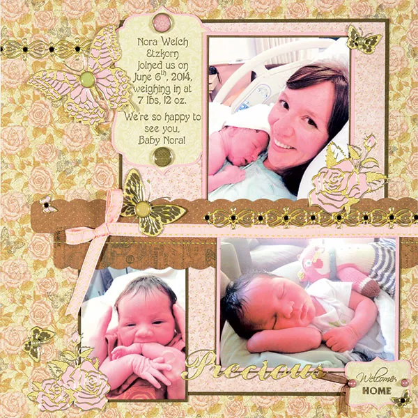 Trace and cut a tiny bracket label from Butterfly Wings ivory paper and stamp “welcome home” on it. Mat on pink cardstock with 1/16" borders, then glue in the lower right corner. Punch a hole in each end and insert pink pearl brads.