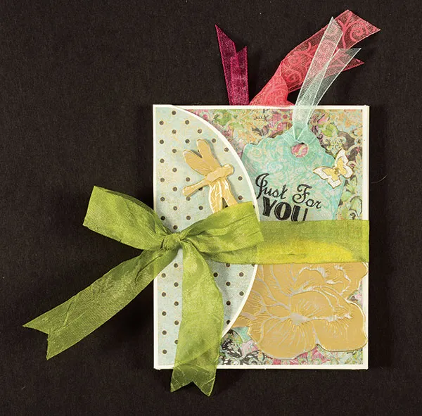 Attach the aqua sheer ribbon to the tag, then glue the tag angled on the front as shown. Cut a 3¼"x2" rose off the Foiled Fancies sheet and sand the raised areas. Glue to the front and place the Dazzles™ as shown.
