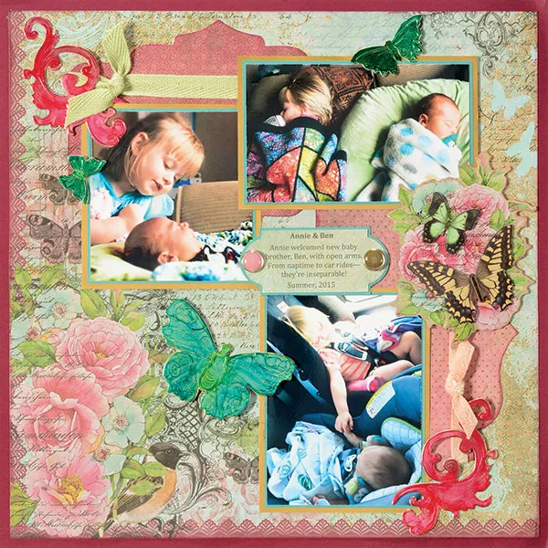 Mat the label on teal cardstock with 1/16" borders. Insert pink and brown Embellies in the label ends and glue as shown. Punch out the butterfly paper tole die-cuts and assemble following the package directions, placing foam tape between the layers. Ink the outer edges, then foam tape to the page as shown.