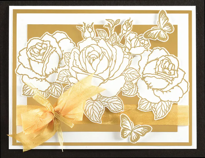 Stamp the smallest rose twice on cardstock and the medium rose once. Cover with embossing powder, tap off the excess, and heat to melt. Stamp and emboss two 1¼" butterflies, then cut out all the roses and the butterflies, leaving a narrow white edge on each.