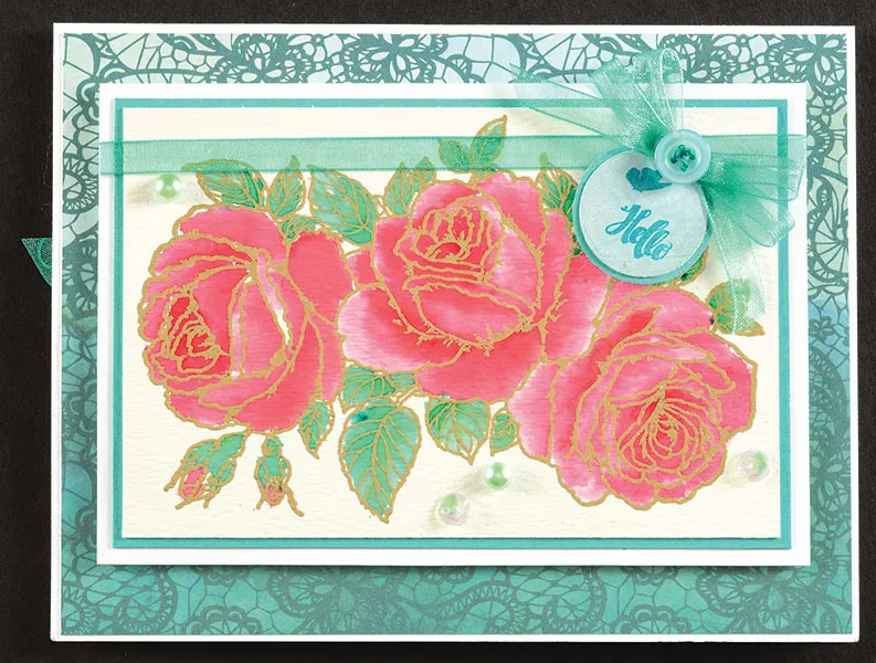 For the card front: Turn the card with the fold at the top. Cut 6 3/8"x4 7/8" Painted Lace teal lace paper and glue centered on the front. Cut 5¼"x3½" watercolor paper, then stamp and emboss the triple rose image on it. Place on the craft sheet and follow the directions above to paint the petals with Fuchsia Color Burst and the leaves with Pthalo Green.
