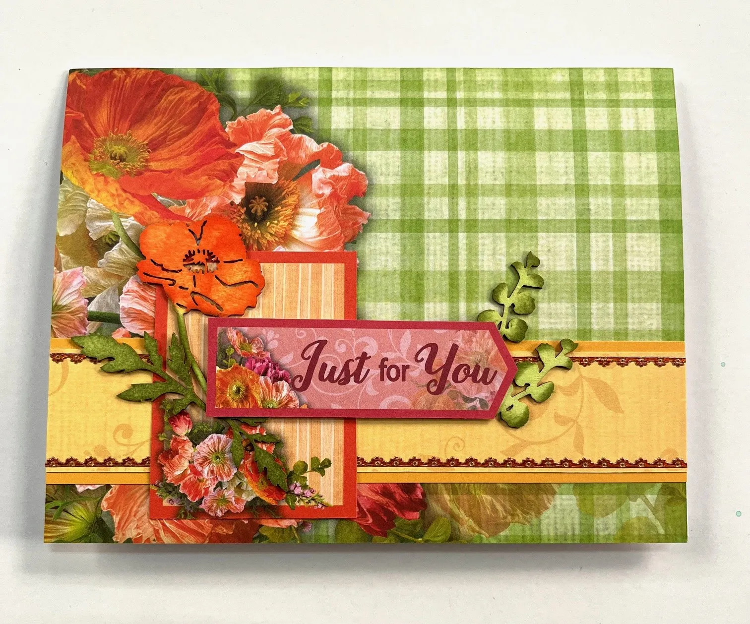 2. Cut out the orange rectangle and the “just for you” cutouts. Glue the rectangle and foam tape the greeting to the front as shown. Remove the chipboard 2" poppy and the leaf sprigs shown from the backing. Press the blossom onto the Warm Honey ink pad to cover it, then lightly press it onto the Tiger Orange pad. Press the stem and the leaf sprigs on the Lime Zest pad, the press the edges with Khaki. Glue the chipboard pieces extending from the greeting as shown.