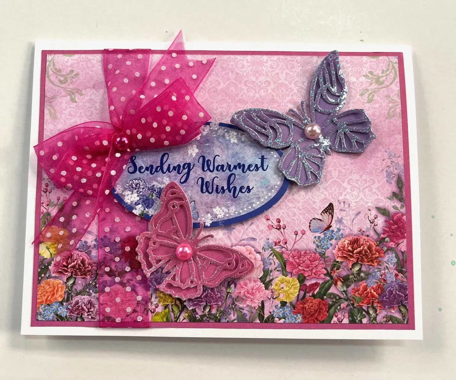 4. Repeat the process with glitter sheet on purple cardstock to die cut a large openwork butterfly and attach it to the matching solid butterfly. Use sticky tape to attach both to the front as shown. Place pink pearls on the bow and butterflies as shown.