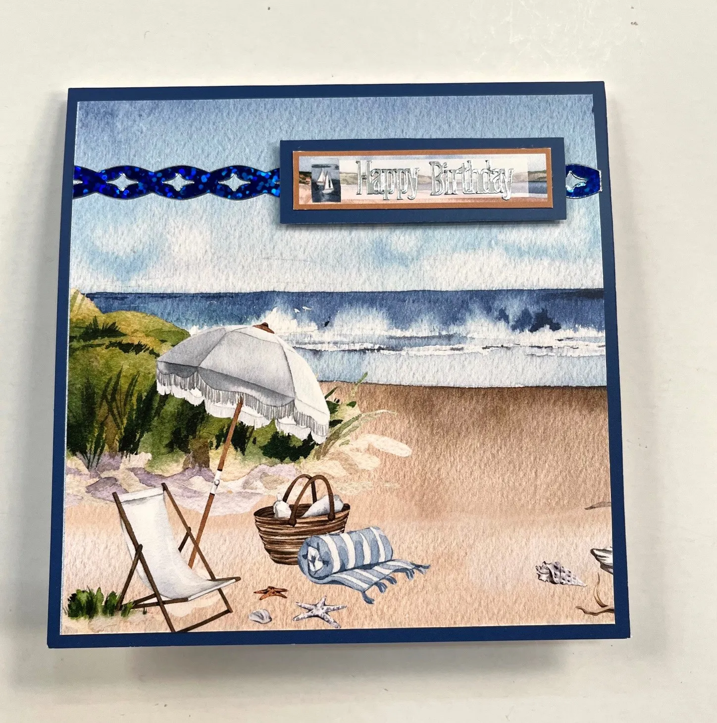 1. For the card front: Place the card with the fold at the top and cut it to 5" long. Cut 5"x5" dark blue cardstock and glue it to the front. Cut 4¾"x4¾" At the Shore umbrella cardstock and place blue border Dazzles™ across it, ⅝" from the top, trimming the excess. Glue the cardstock centered on the front.
