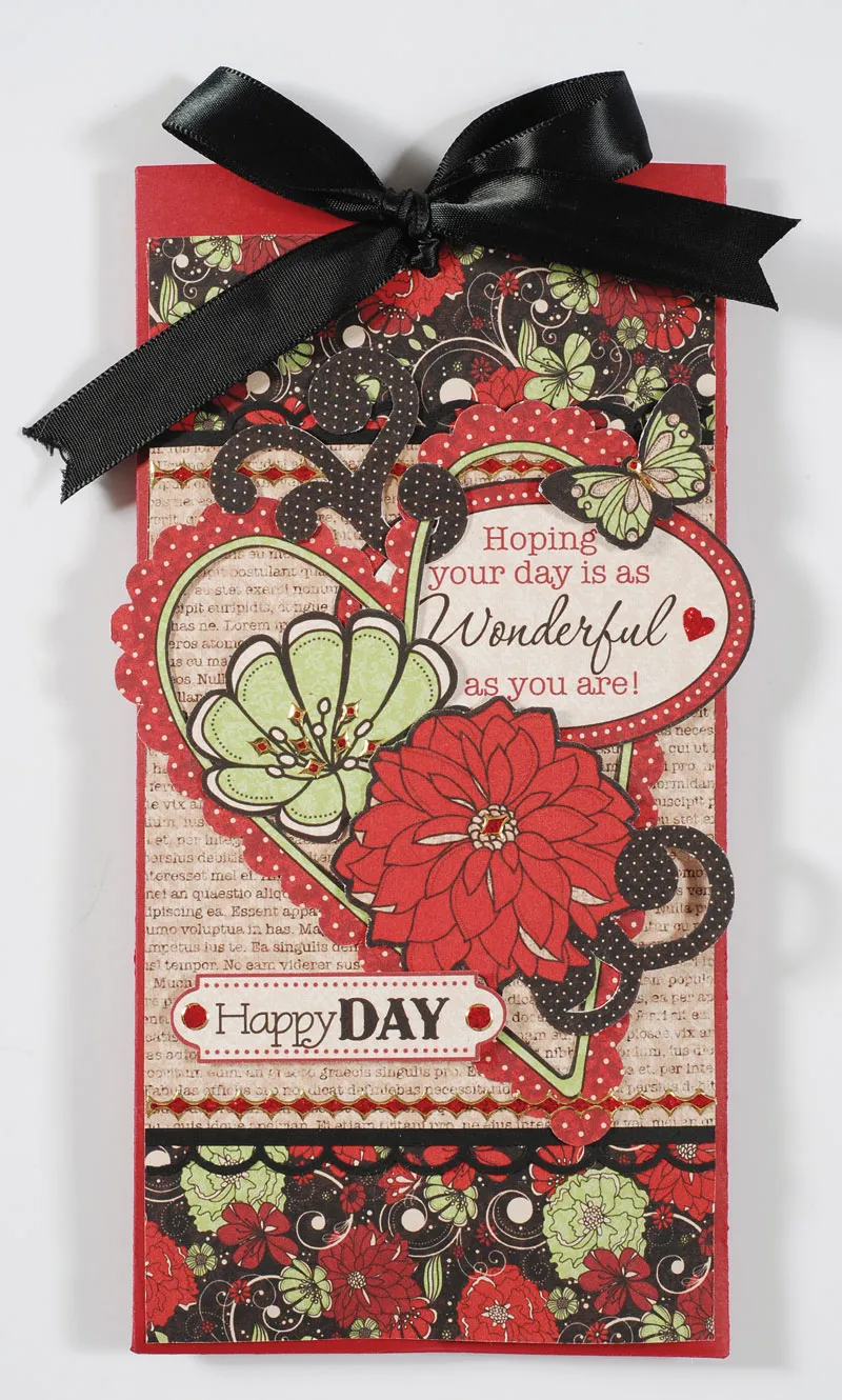 Punch out the Red Velvet open heart, 2½" red flower, 1¼" green flower, 1¾" black swirl, and 1¼" green butterfly die cuts and remove the nibs. Cut out “hoping your day…” oval and “happy day” label. Glue the oval to white cardstock and trim along the edge. Glue all the pieces except the small label and butterfly to the front, overlapped as shown. Foam tape the label and butterfly as shown.