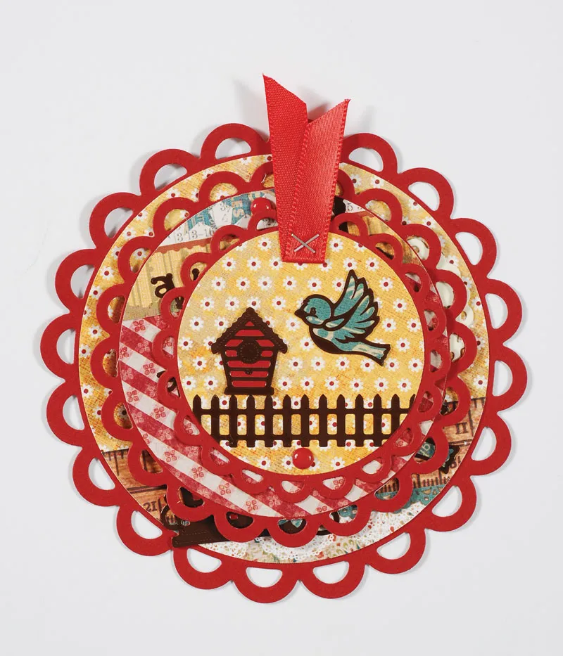 Cut 2 7/8"x1" Home Grown striped paper and glue along one side of the red checks circle, then trim the excess. Glue the circle centered on the 3½" lace circle. Trim the Dazzles™ birdhouse on a post to 2 1/8", then back it with cardstock and Home Grown small ads paper as before. Glue to the checked circle near the left edge.