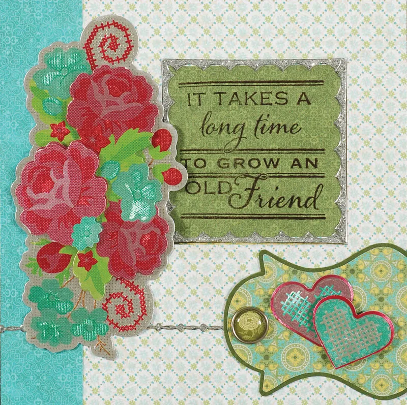 Use the tool kit to trace and cut the right 2½" of the Victorian label from Rosemary & Thyme yellow tapestry paper. Mat on green cardstock with 1/32" borders, then stamp “we’ll be friends forever” on it. Insert a brad in the right end and glue at the lower left as shown. Place a Dazzles™ border from the brad across the inside.