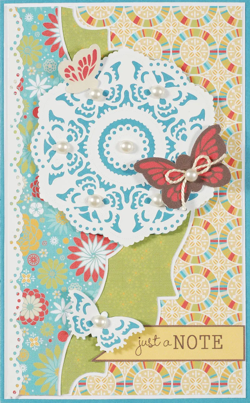 Place a Dazzles™ border along the left edge of the blue floral paper, then mat the entire constructed front on white cardstock and glue centered on the card front. Cut out “just a note” greeting and glue to the front at the lower right. Back the Dazzles™ doily and 1¼" butterfly on blue cardstock and trim around the edges. Foam tape the doily ¾" from the top edge and the butterfly over the greeting.