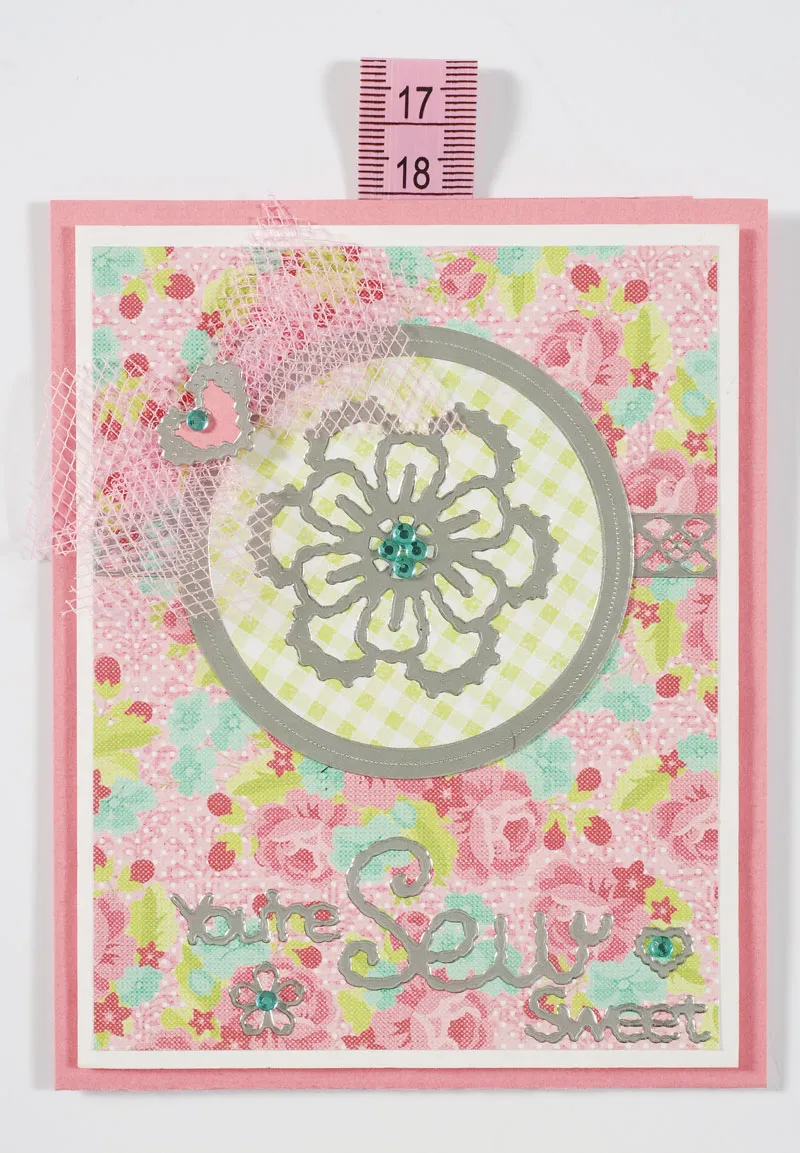 For the front: Cut 3¾"x4¾" white cardstock and 3½"x4½" Penelope floral paper, then glue the floral paper centered on the cardstock. Cut 3½" of the Dazzles™ border and place across the floral paper, 1½" from the top. Place the embroidery hoop Dazzles™ on Penelope green paper and cut along the edges. Glue to the front as shown.