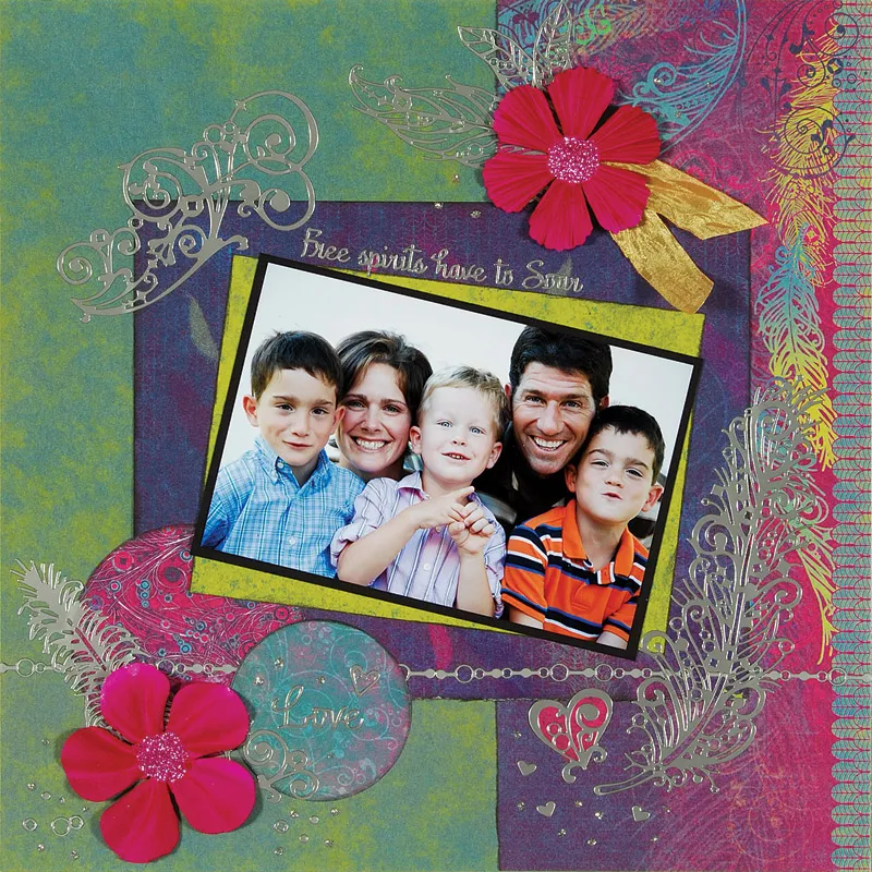Dazzles™: Left page: Back the Mystic Friends & Feathers Scrapbooking Dazzles™ heart/wings Dazzles™ with Feathers Double-Sided paper pink and light blue swirl papers. Glue to the photo top right corner. Place large feather Dazzles™ at the lower left photo corner with a large swirl Dazzles™ on the lower right. Place small swirl Dazzles™ at photo top left and lower right corner. Place the “you give my heart wings” Dazzles™ on the 2 1/2” circle as shown. For the right page: Place Mystic Friends & Feathers Scrapbooking Dazzles™ large feather at the lower right photo corner. Back small heart Dazzles™ with Feathers Double-Sided paper and glue to the left of the feather. Place a large swirl Dazzles™ at the top left photo corner. Place “Free spirits have to soar” above the photo and “Love” on the 2 1/2” circle below photo.