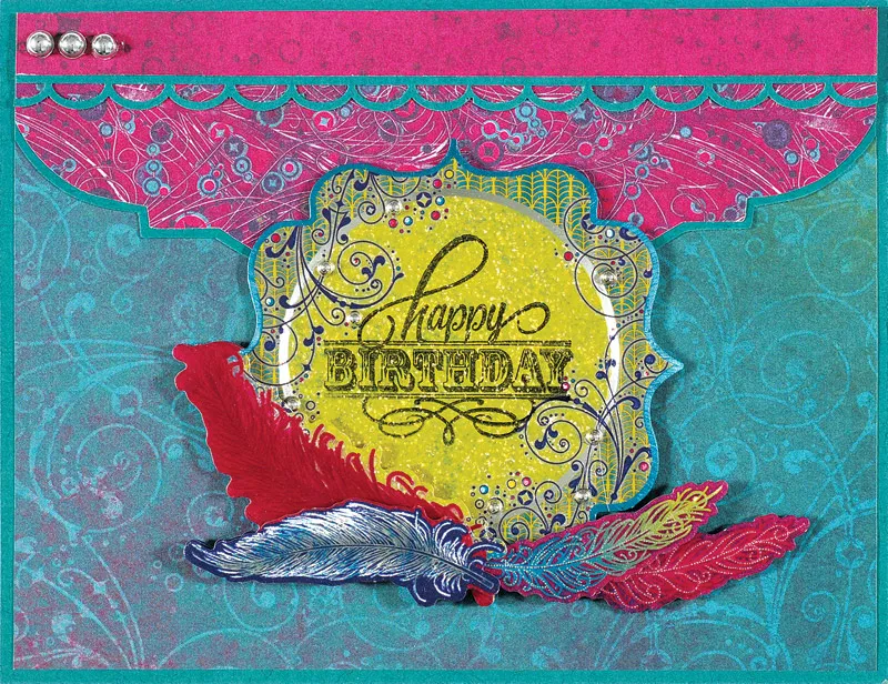 Trace and cut a small label from Fancy Feathers aqua textured paper and stamp “hope your birthday…” in the center. Insert a ½" brad in each end, then foam tape the label centered on the inside. Place pearls as shown.