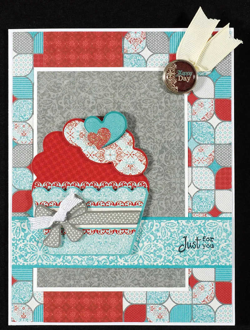 Cut 4 7/8"x1" Robin’s Red blue tapestry paper and mat the long edges on teal cardstock with 1/16" borders. Glue to the squares paper, 1¼" from the bottom. Stamp “just for you” on the right end. Punch out the Papier Tole cupcake die cuts and assemble with foam tape between the layers. Knot the white ribbon and glue to the bow, then glue the cupcake as shown.