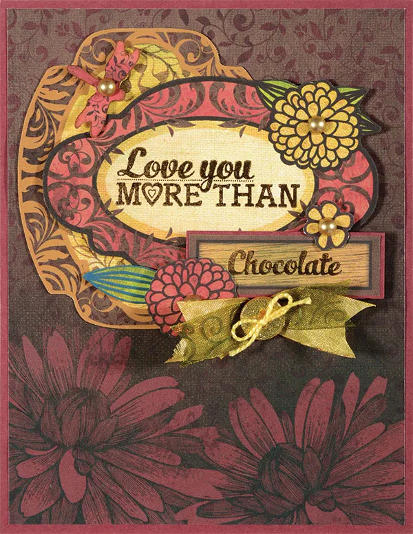 Punch out the die-cuts shown and remove the nibs. Glue the tan/yellow label die cut vertically near the upper left corner. Stamp “love you more than” on the rust/yellow label and foam tape it centered 1" from the top.