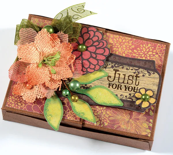 For the top: Cut two 1 7/8"x2 3/8" Nature’s Walk rust floral papers and glue one to each lid panel. Punch out the die cuts shown and remove the nibs. Stamp “just for you” on the right end of the brown label, then center it on the front and glue just the left half to the left lid. Glue the leaves and foam tape the rust and yellow flower die cuts as shown.