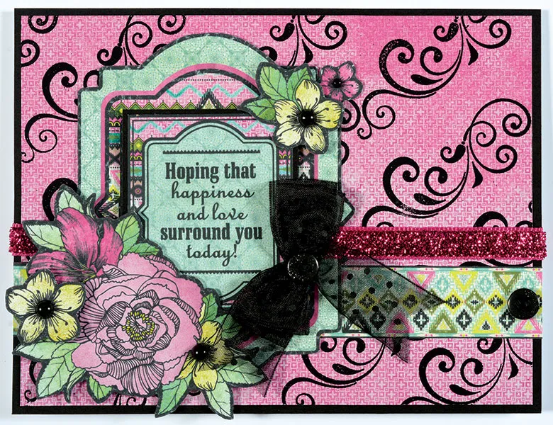 For the card front: Turn the card with the fold at the top, then cut 6½"x5" black cardstock. Cut 6¼"x4¾" Daydreams pink paper and stamp the large flourish angled across the paper repeatedly, creating diagonal stripes (see the note above). Cover with embossing powder, tap off the excess, and heat to melt. Glue the paper centered on the cardstock.