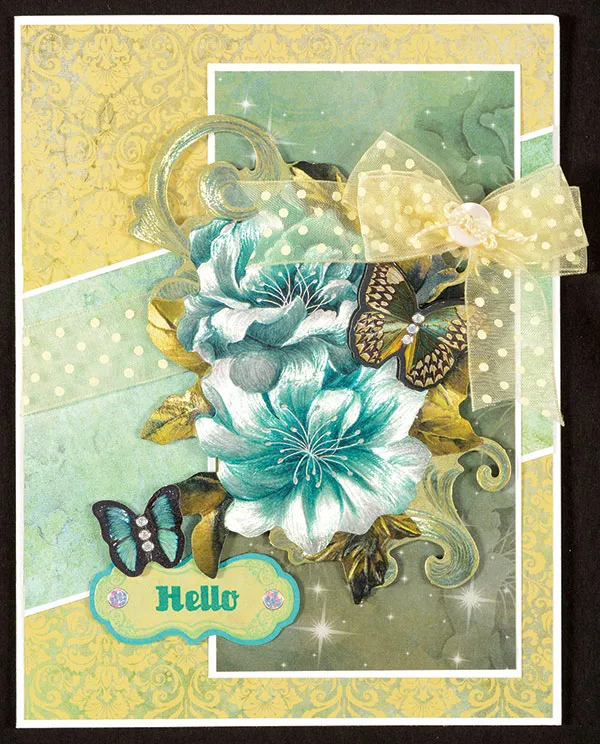Punch out the floral spray paper tole die cuts and assemble following the package directions, placing foam tape between the layers. Foam tape the design to the front as shown. Punch out an extra art butterfly and foam tape near the spray at the lower left.
