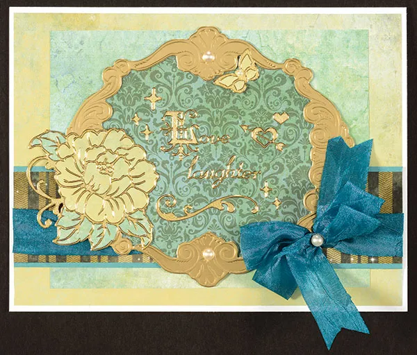 Cut the frame from the Foiled Fancies sheet, then glue Floral Fantasy blue tapestry paper behind it and trim along the edges. Glue centered on the front. Place a 2½"x2¼" Dazzles™ rose on Floral Fantasy yellow marble paper with the leaves on blue marble paper, then trim along the edges. Glue to the frame on the left end.