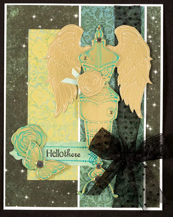 Cut the dress form, two roses, wings, and a 1¼" butterfly from the Foiled Fancies sheet and place on the craft sheet. Using your finger, pick up Vibrant Turquoise paint and rub it across the dress form to completely cover it. Let it set for one minute, then use a paper towel to rub most of the paint off, allowing some to remain in the depressed areas. Let dry.