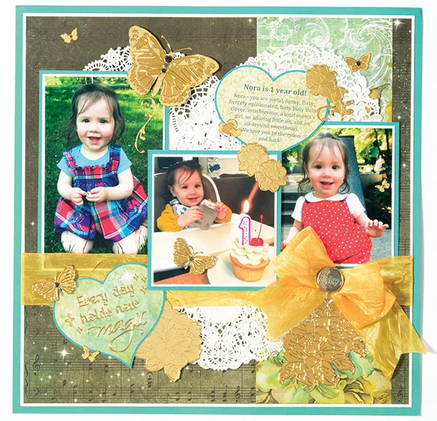 With two doilies placed vertically, overlap the lower ends to create a heart shape that’s 9¾" wide. Glue together, then glue the heart centered on the page. Wrap a 14" ribbon across the page, 3¼" from the bottom, and glue the ends to the back.