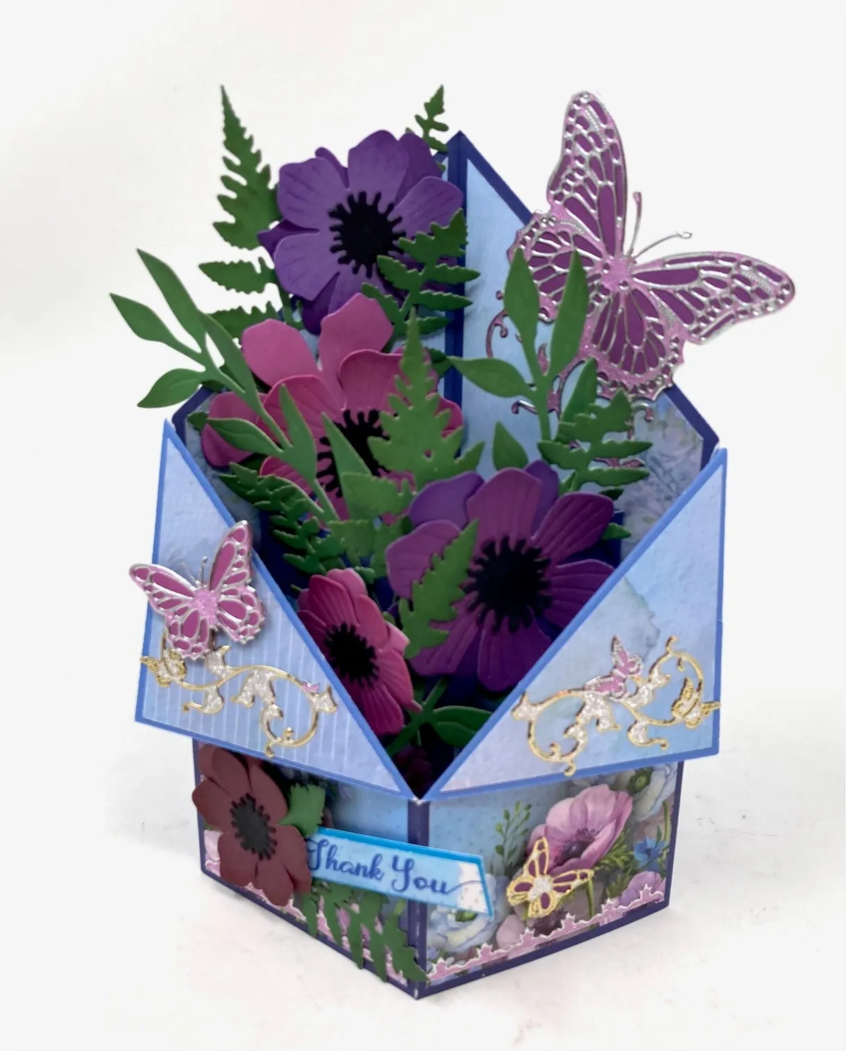6. Place pink pearl border Dazzles™ along the lower front panels, trimming the excess. Glue leaf sprigs to the lower left front, then glue a small windflower over them. Foam tape the “thank you” die-cut extending from under the flower. Place silver pearl swirl Dazzles™ on the triangular panels. Back two smaller pink and silver pearl butterflies with purple cardstock, then foam tape one to the lower right and the other to the left triangular panel.
