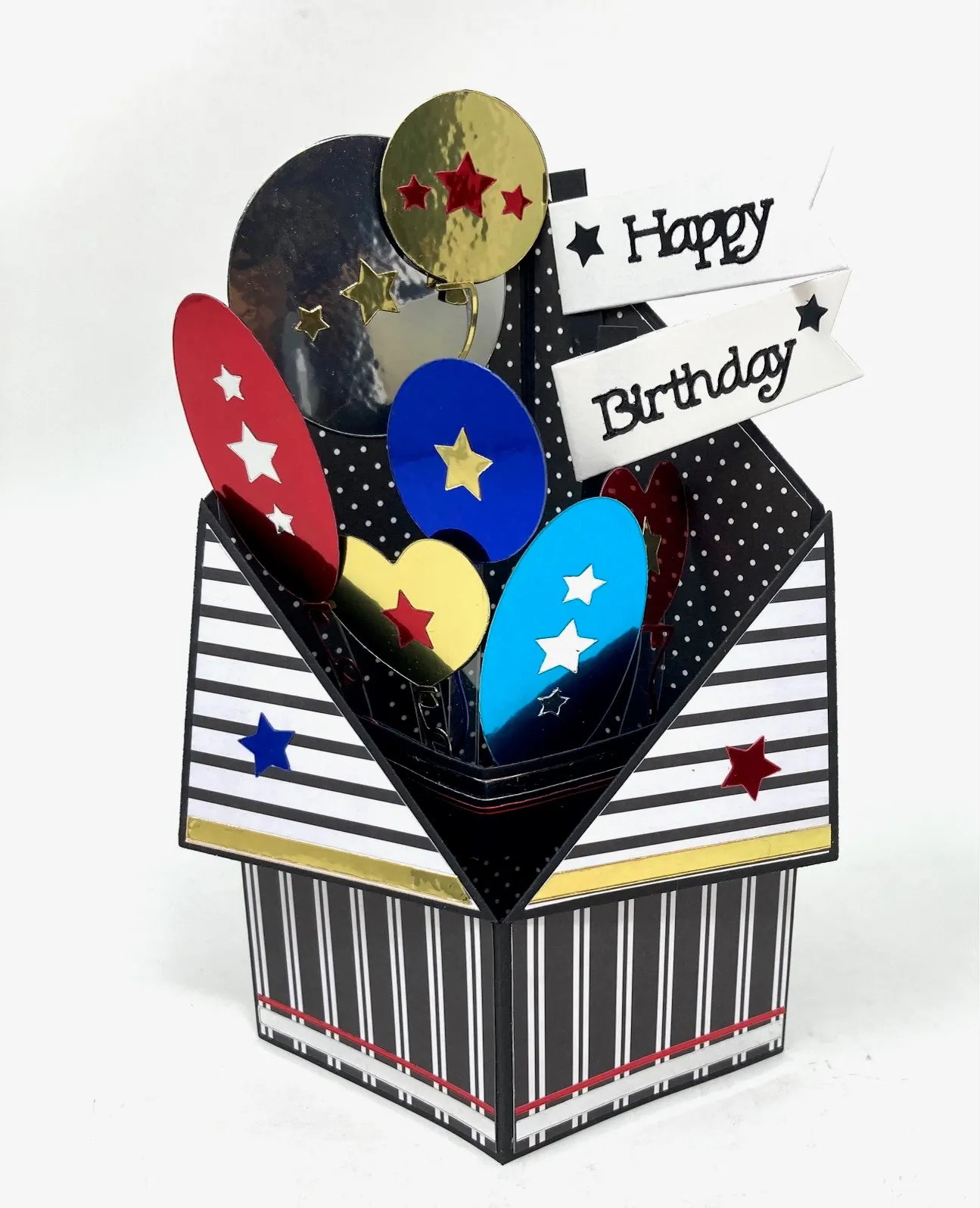 4. Die cut two long banner labels from white cardstock and fold both in half. Place double-sided tape on the inside of one, then place a black strip against the fold and press the banner ends together. Repeat with the second banner and black strip. Place “happy” and a star Dazzles™ on one flag and “birthday” and a star on the second. Glue the happy flag to the inside right back and the birthday flag to the back of the crossbar, extending upward as shown.