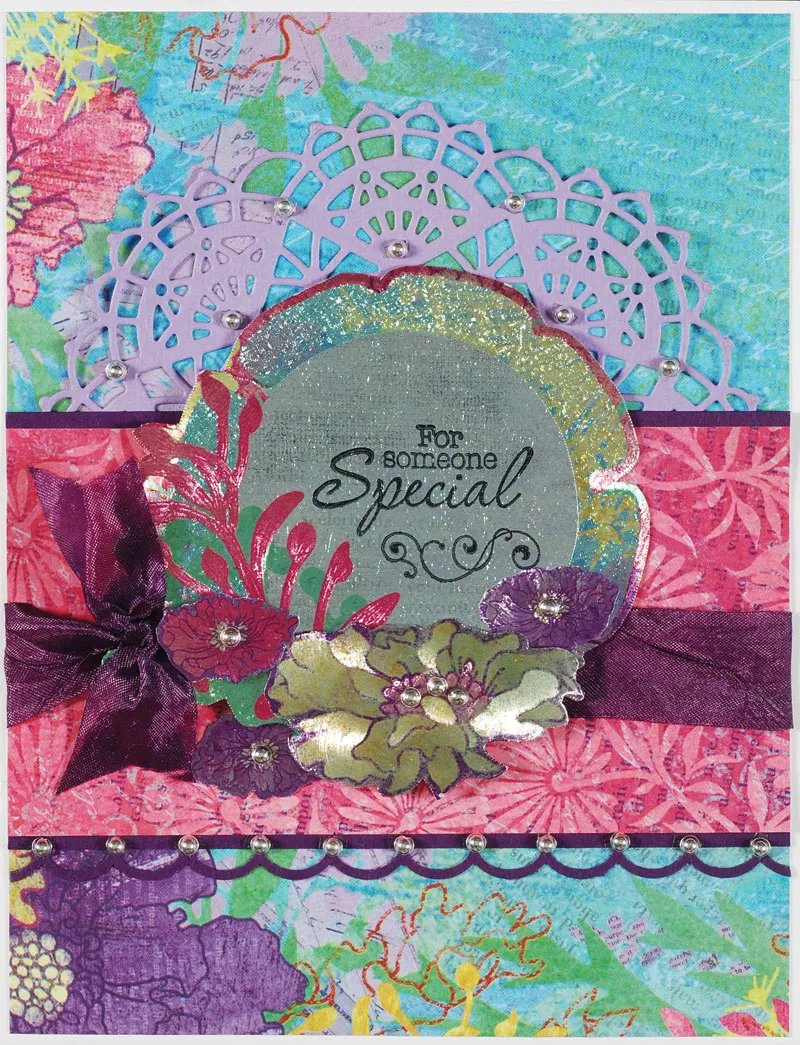 Punch out the papier tole label pieces. Stamp “for someone special” and a swirl on piece #2, then assemble the pieces, placing foam tape between the layers. Punch out the three smaller extra art flowers. Glue one to the upper right of piece #3 and foam tape one to the left of piece # Glue the label to the front as shown, then glue the third extra flower extending from under it at the lower left. Place the pearls as shown. Knot a 3" ribbon and glue just left of the label.