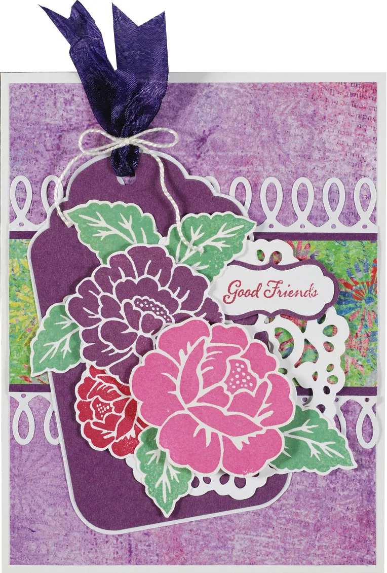 Following the manufacturer’s directions, die cut the 1 3/8" wide border from white cardstock, then cut in half lengthwise. Cut both sections to 4¾" long, then glue one above and one below the green strip as shown. Trace the tag pattern and cut from purple cardstock, then mat on white cardstock with 1/32" borders. Punch a hole at the top and thread with ribbon. Tie the ribbon ends together with embroidery thread, then glue the tag to the front, angled as shown.