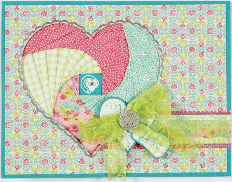 Use the template to trace and cut rounded tag D from Penelope green paper. Stamp “love” with Deep Lagoon on the tag, then mat on cardstock with 1/32" borders. Foam tape the tag extending off the large embossed heart. Make a ribbon bow with four loops and tie the center with thread. Glue to as shown, then place a sparklet in the bow center. Place a rhinestone in the small embossed heart center.