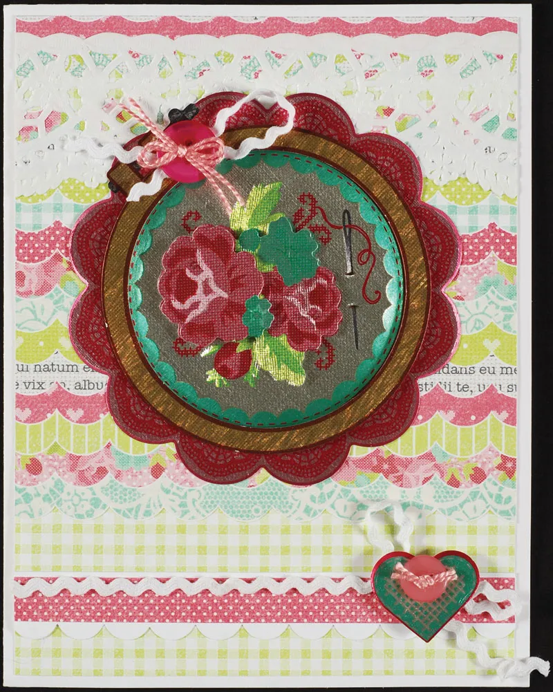 Punch out the papier tole embroidery hoop pieces and follow the directions to assemble, placing foam tape between the layers. Glue to the front, 7/8" from the top, with the screw at the upper left. Loop and glue 4" of rick rack as shown. Use tape to secure the 5/8" button on top, then tie a bow with two lengths of thread and glue to the button center. Punch out the green extra art heart and foam tape over the bow center. Tape the 7/16" button to the heart, then knot two threads together, trim, and glue to the button.