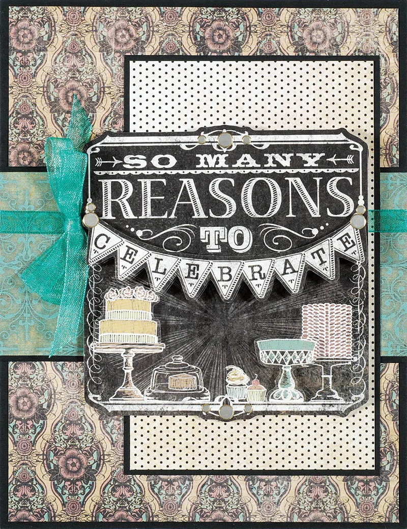 Cut 3"x5" Chalkboard white dotted paper and mat on black cardstock with 1/16" borders. Glue to the front, 3/8" from the right edge, slipping it under the ribbon. Punch out the “so many reasons to celebrate” Papier Tole die cuts and follow the package directions to assemble with foam tape between the layers. Glue to the front as shown.