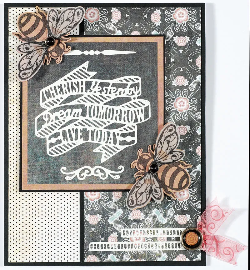 Stamp the bee on Chalkboard peach paper twice and on vellum twice. Cut out the peach bees, leaving a narrow edge. Cut out just the wings from vellum, leaving them connected in the centers. Use the clear tape to attach the wing centers to the bees, then use the clear squares under the vellum wings. Insert a small black brad in each, then glue and foam tape the bees to the saying as shown.