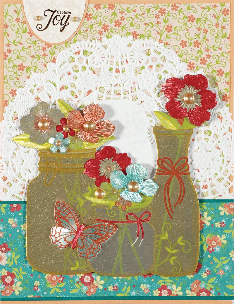 Cut 5"x2" Pretty Little Posies blue floral paper and mat the long edges on teal cardstock with 1/16" borders. Glue along the bottom. Punch out the vases Papier Tole die-cuts and set aside #2 and #3. Assemble the remaining pieces with foam tape between the layers. Foam tape the design to the front, 5/8" from the bottom.