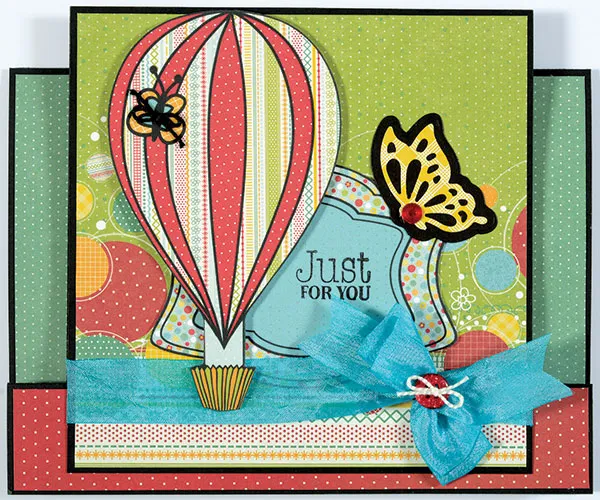 Punch out the blue label and balloon die cuts and remove the nibs. Turn the label upside down and glue it to the front panel, tucking the lower edge under the ribbon. Stamp “just for you” on the label’s right end, then foam tape the balloon over the left end. Die cut a small butterfly from Hopscotch yellow plaid paper and its shadow from black cardstock. Glue together, then glue to the label at the upper right.