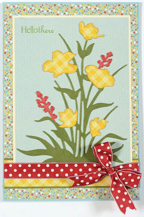 Glue the flowers to the blue paper, then stamp “hello there” in the upper left corner with Mint. Glue the paper to the front, slipping the lower edge under the ribbon. Tie a red bow and glue to the first ribbon, 1" from the right edge.
