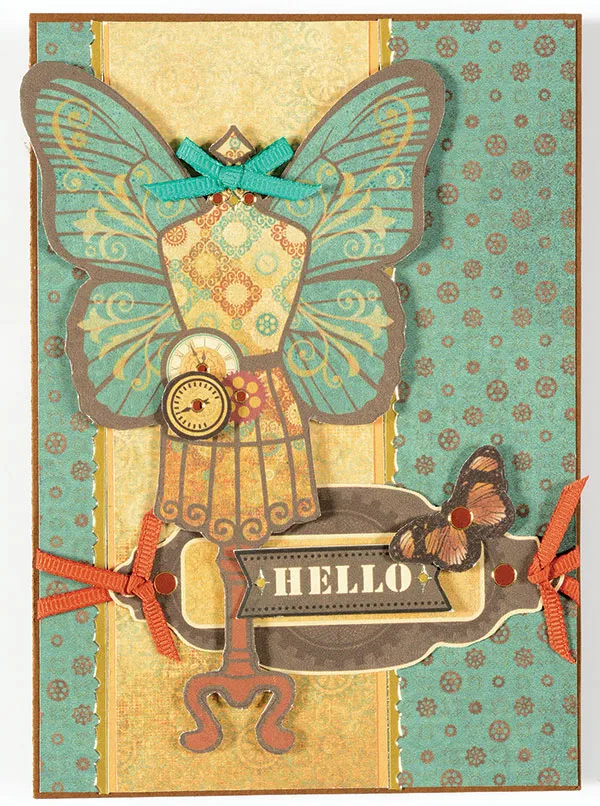 Cut out the Steampunk “hello” label. Punch out the remaining Steampunk die-cuts shown and remove the nibs. Foam tape the dress form along the left edge, then foam tape “hello” to the label, overlapping the dress form stand. Foam tape the butterfly and dial as shown.