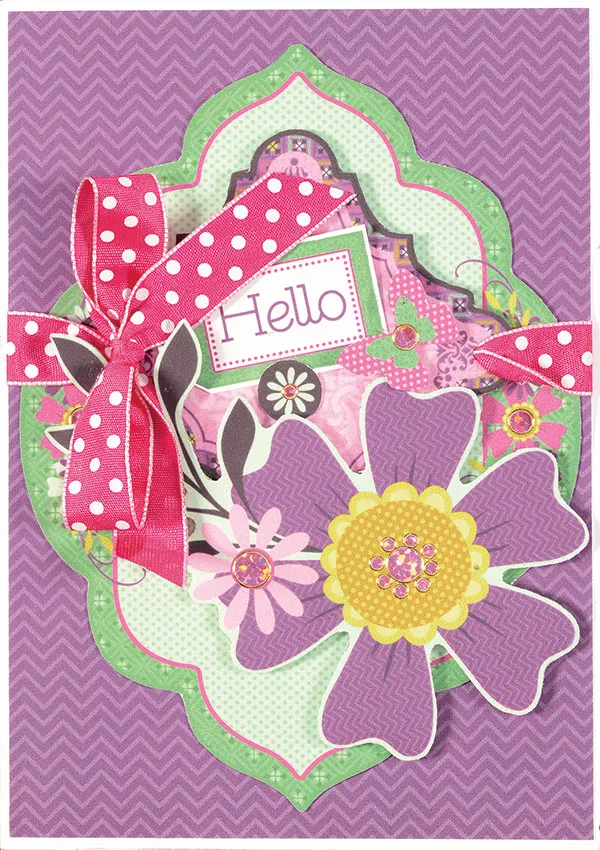Punch a hole in two opposite corners on the pink label, then thread it onto a 5" ribbon. Foam tape the pink label to the green label 1" from the top, turned on point. Wrap the ribbon ends to the paper back and glue in place. Glue the purple paper to the card front. Tie a shoestring bow and glue to the pink label’s left hole.