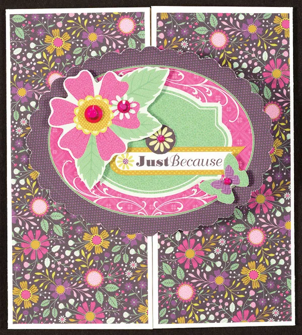 Cut out the “just because” label. Glue the sentiment and small flower and foam tape the large flower and butterfly die-cuts as shown. Place rhinestones on the die-cuts as shown.