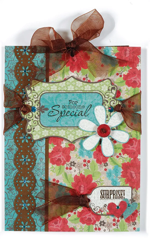 Stamp “for someone special” on the Chocolate-Dipped green/blue label and punch a hole in each end. Cut two 4" lengths of ½" ribbon and knot the center of each. Thread the ribbons, front to back in the holes, then foam tape the label to the paper, 1" from the upper edge. Glue the ribbon ends to the back, then finish gluing the paper to the card front. Stamp “surprise” on the small tan tag and attach a 4" length of ½" ribbon. Foam tape near the bottom. Glue the remaining Chocolate-Dipped die cuts and place the Dazzles™ as shown. Cut a 1" length of ½" ribbon to ¼" wide and thread through the button holes. Glue the ends on the back, then glue the button to the flower as shown.