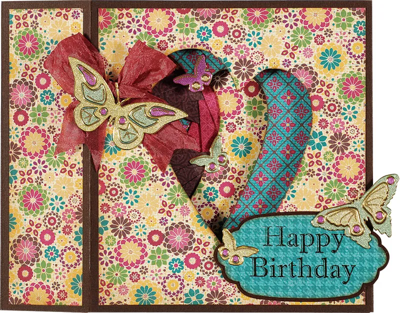 For the front section: Cut 4¼"x4¾" Kaleidoscope light floral paper and ink the edges. Glue centered on the center panel of the remaining cardstock piece. Cut out the heart (traced on the back in step 1) and ink the window edges. Fold the end panels back. Wrap the end panels of the front section over the end panels of the back section and glue. Tie a ribbon bow and glue at the upper left. Trace and cut the label from Kaleidoscope blue houndstooth paper, ink the edges, and mat on cardstock with 1/16" borders. Stamp “happy birthday” on it and glue to the lower right. Construct two larger butterfly Dazzles™ on cardstock and cut around the edges. Glue and place the Dazzles™ as shown.