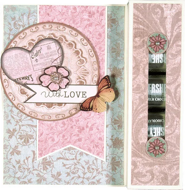 For the inside: Cut 4 5/8"x4¾" Spun Sugar pink border paper and glue centered on the inside back. Close the card. Fold the box and glue to the inside back, aligning it with the right edge of the card front. Open the card and glue the sentiment, swirl, and butterfly die cuts to the inside as shown. Place three pearls on the swirl.