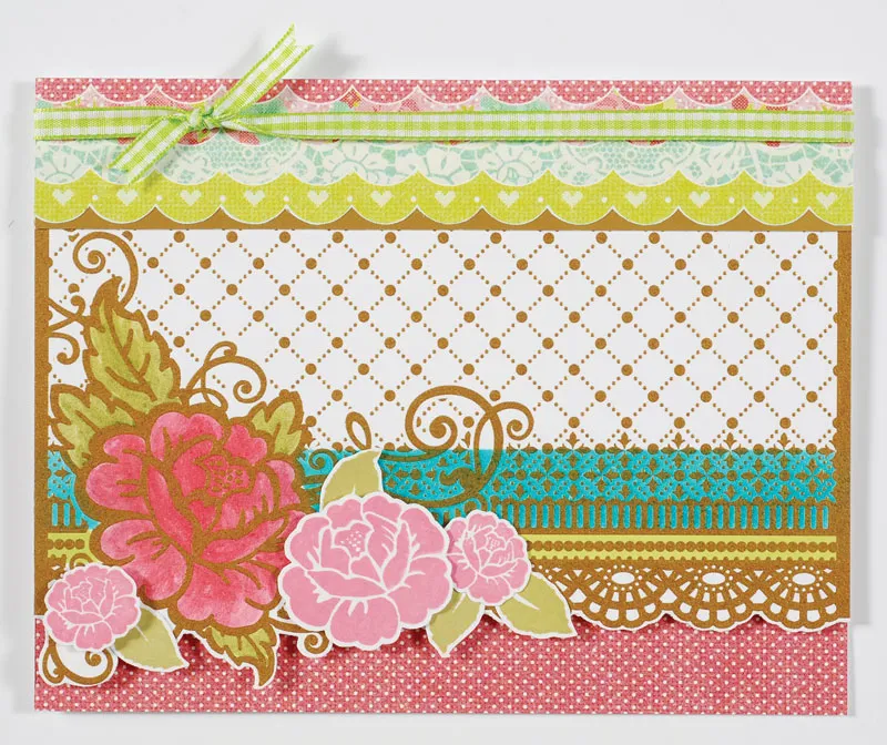 For the card front: Turn the card with the fold at the top, then trim ¾" off the lower front edge. Cut along the lower edge of the Color Me™ rose border card topper. Place it on the craft sheet, then place stencil tape just to cover the lace edge and another strip ¼" above it. Place short pieces to cover the rose. Swipe the Lime ink pad over the exposed stripe. Remove the tape.