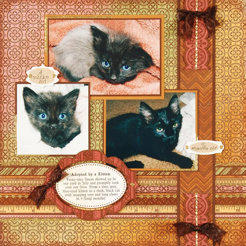 Trim the photos to 3 3/8"x3 3/8", 4 3/8"x4 5/8", and 5 3/8"x3 5/8". Mat the smallest photo on brown cardstock with 1/16" borders. Mat the medium photo on caramel cardstock with 1/16" borders, then on brown cardstock with 1/32" borders. Mat the largest photo on brown cardstock with 1/32" borders, then on caramel cardstock with 1/8" borders. Glue the photos to the paper, overlapped as shown.