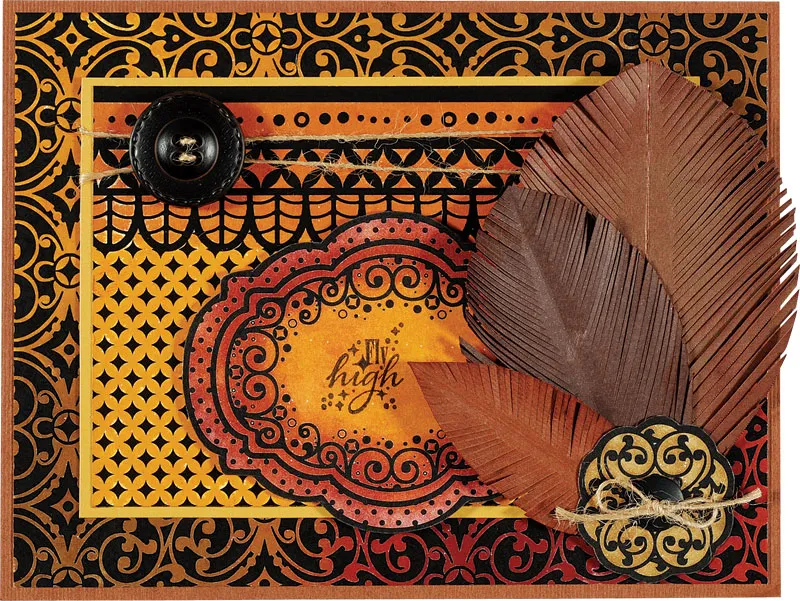 For the card front: Turn the card with the fold at the top and cover the front with rust cardstock. Cut 6¼"x4¾" Color Me™ fanciful tiles paper and place on the craft sheet. Use the applicator to sponge Mahogany, Gathered Twigs, and Wild Honey inks across the paper, alternating the colors and blending where they overlap. When dry, glue centered on the front.