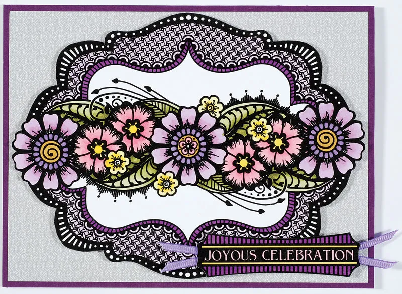 Color the pink flowers with PP3 and shade with PP5. Color the centers with CT3. Color the yellow flowers with CT3. Color the leaves with DG2 and shade with DG4. Color the label’s inner border with PL4 and the middle border with LV1. Foam tape the label to the center front.