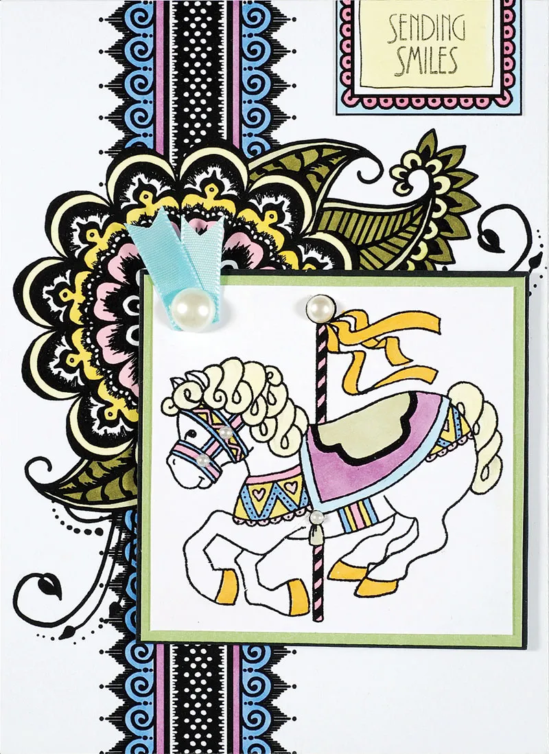 Cut 3 1/8"x3" ultra smooth white cardstock and stamp the pony on it with VersaMark™ ink. Cover with embossing powder, tap off the excess, and heat to melt the powder. Leave the pony body white, then color everything else with pens, using the lighter colors in the sets.