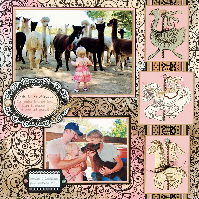 Insert a ½" brad in each end of the large label, then foam tape it between the photos near the left edge. Glue the small label as shown. Make a 4-loop bow with the natural jute and tie the center with a 4" strand. Trim the ends, then glue the bow to the large label below the right brad. Tie one natural and two black jute shoestring bows and glue to the animals as shown. Insert a ¼" brad in each carousel pole top.