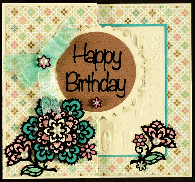 For the front: To close the card, crease the 6" score in a valley fold, then crease the 9" score above and below the scalloped circle in a mountain fold. Die cut a 2½" circle from Emma’s Garden brown flowers paper and glue centered on the swinging portion. Place “happy birthday” Dazzles™ on the brown circle.