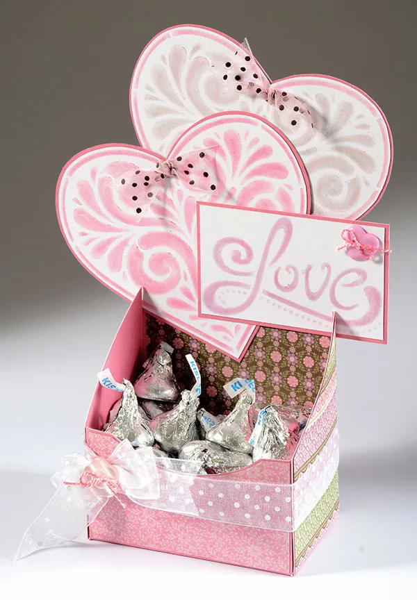 For the dispenser inside: Trace and cut the inside paper pattern from Kindred Spirits brown floral paper and glue centered on the inner back panel. Tape the stencil to white cardstock and use the applicator with dark pink to chalk the heart design. Remove the stencil, then tape it to a second cardstock and repeat the heart design, using dark gray. Chalk the edges of the larger sections in the design with dark pink. Remove the stencil. Chalk “love” on white cardstock with lavender and pink chalks.