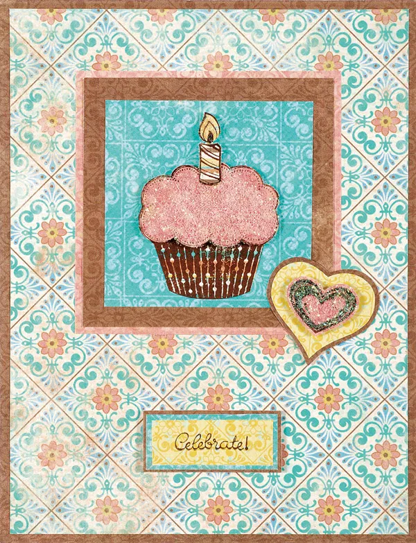 Trace the C-4 heart from the template onto Nostalgia yellow dots paper and cut out. Mat on Nostalgia brown tiles paper with a 1/32" border the glue near the cupcake as shown. Stamp the heart onto Nostalgia coral paper, add glue and glitter, then foam tape to the yellow heart when dry. Stamp “celebrate” on Nostalgia yellow dots paper and trim to 1 5/8"x½". Mat on Nostalgia blue tiles paper with 1/16" borders, then on Nostalgia brown tiles paper with 1/32" borders. Foam tape to the front as shown.